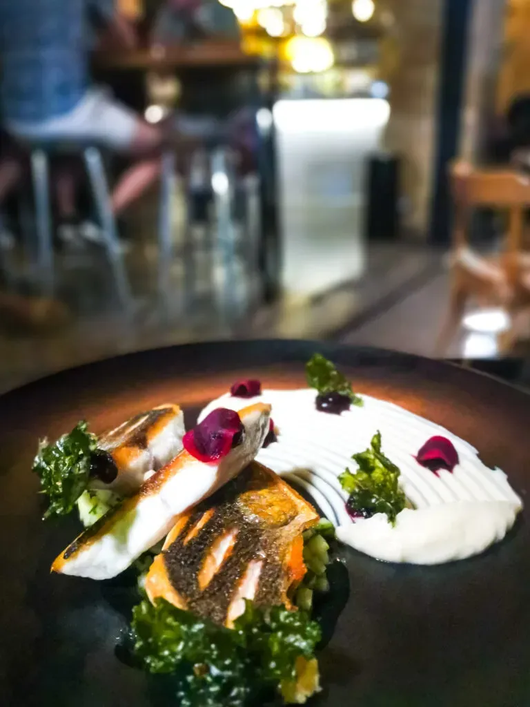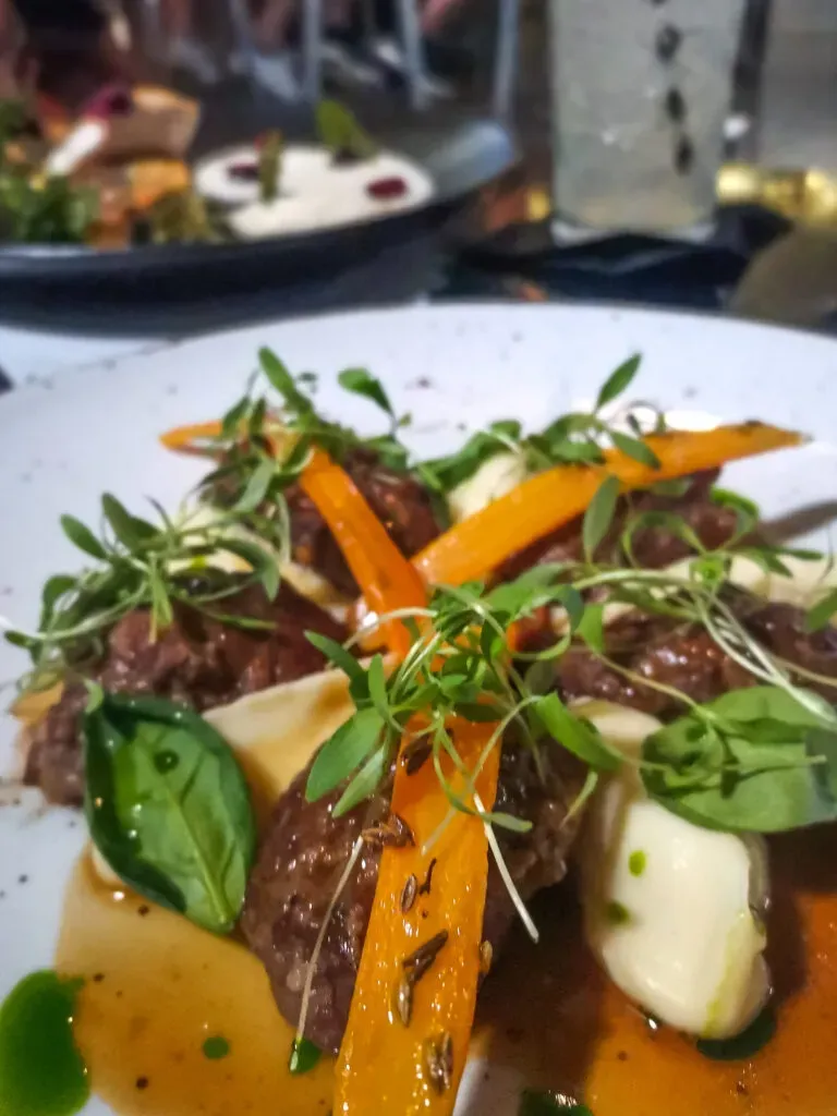 Pork is notoriously difficult to cook and prepare in a way that doesn’t’ resemble Gran’s Sunday roast, or a leather shoe. It’s a real art to cook pork à la carte; retaining the moisture, natural pork flavours, and texture is the real challenge. They nailed it! This dish is coupled with commandaria-yuzu, roasted carrots, and a parsnip puree. All the individual elements of this dish come together so well, each complimenting each other and so tasty on their own. Gran would be proud.